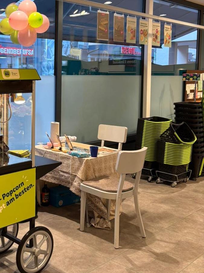 Möbel besorgen: Holt euch in der Filiale bzw. beim Bistro zwei Stühle. Holt den "Denn's Bio" Klapptisch aus dem Auto (muss stabil und wackelfrei stehen).