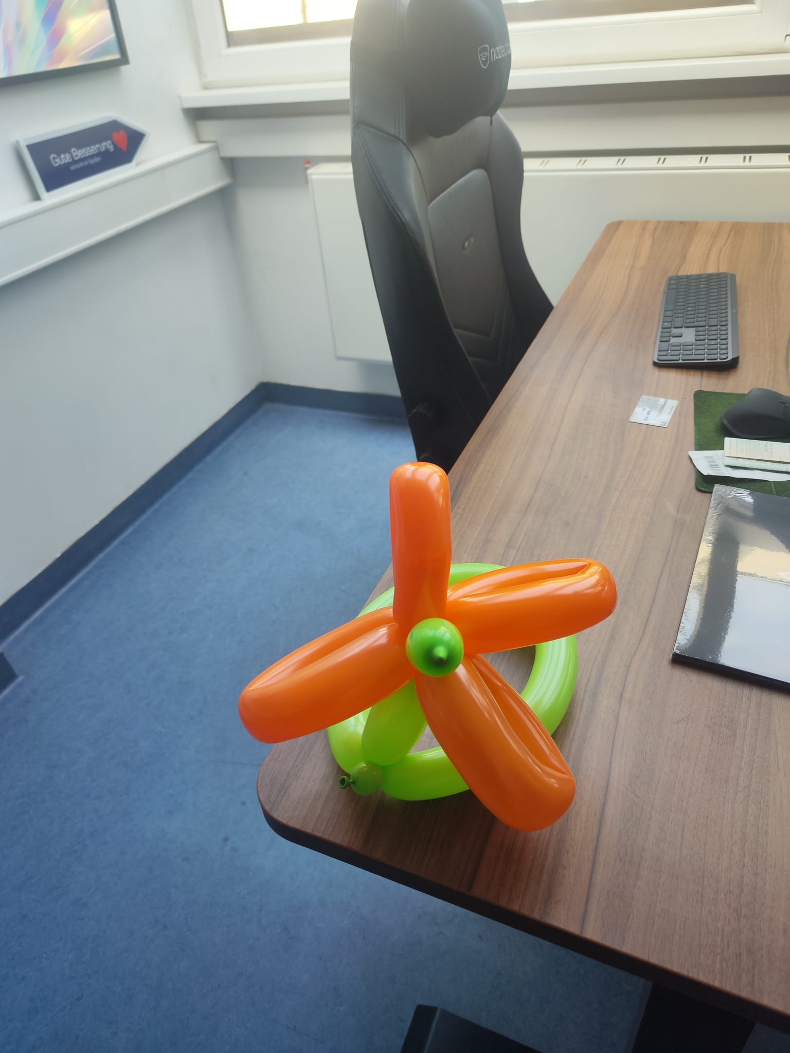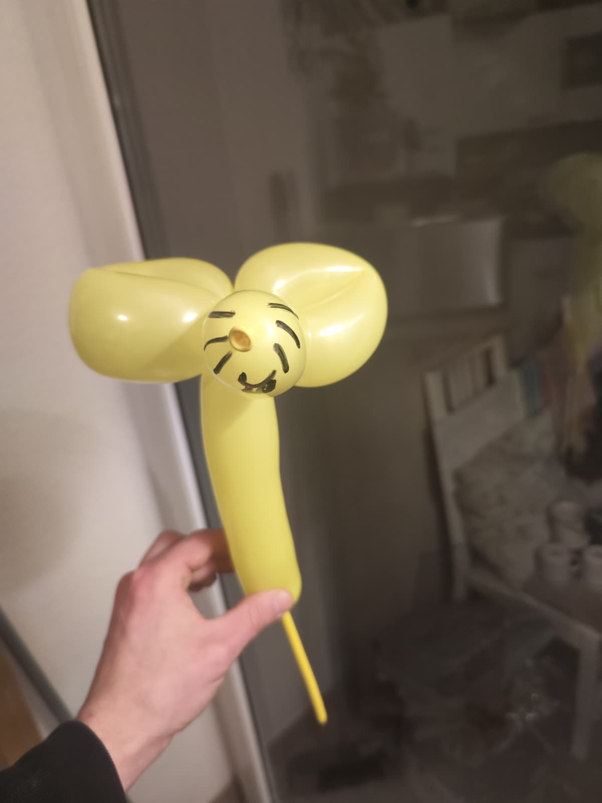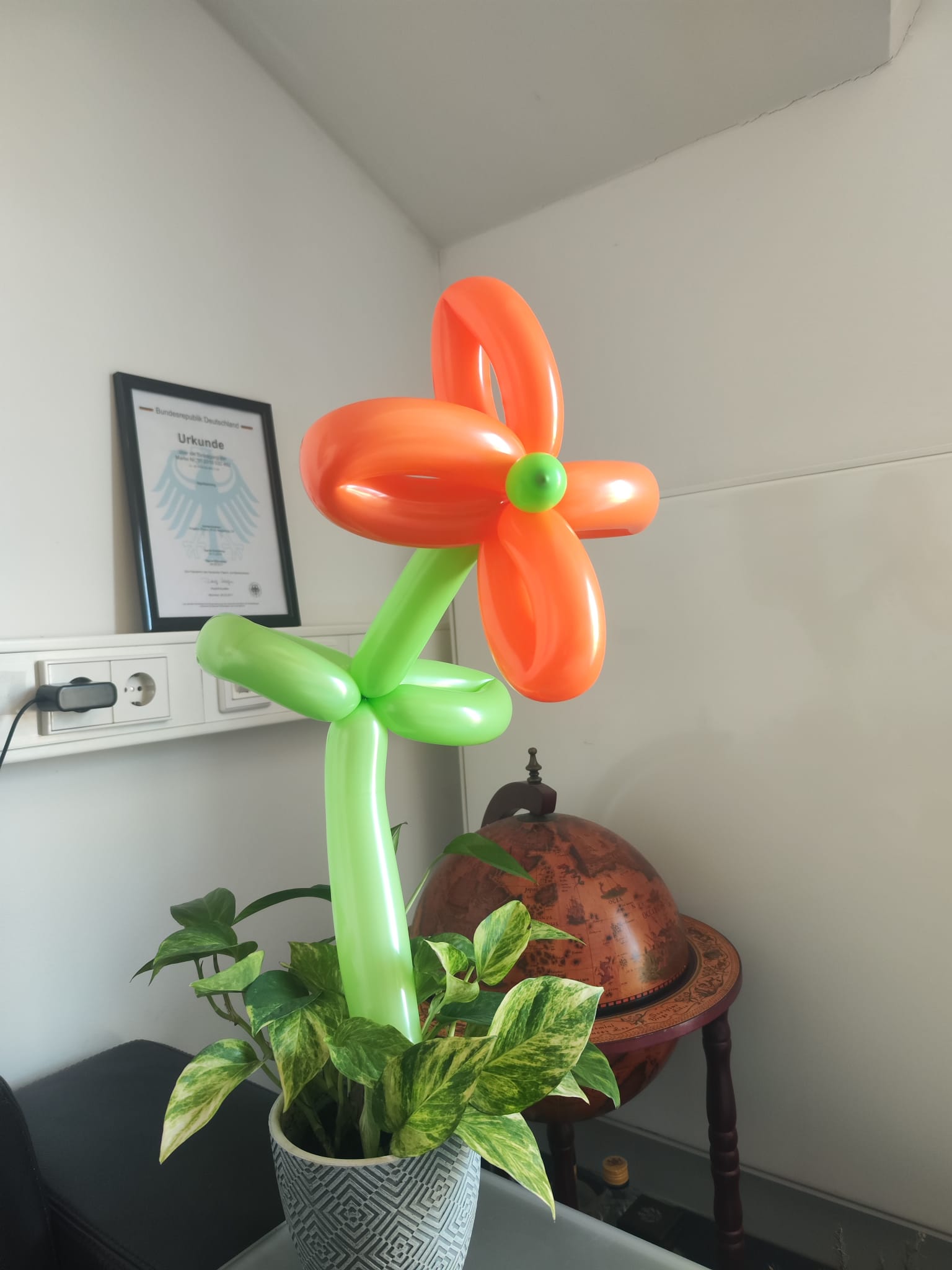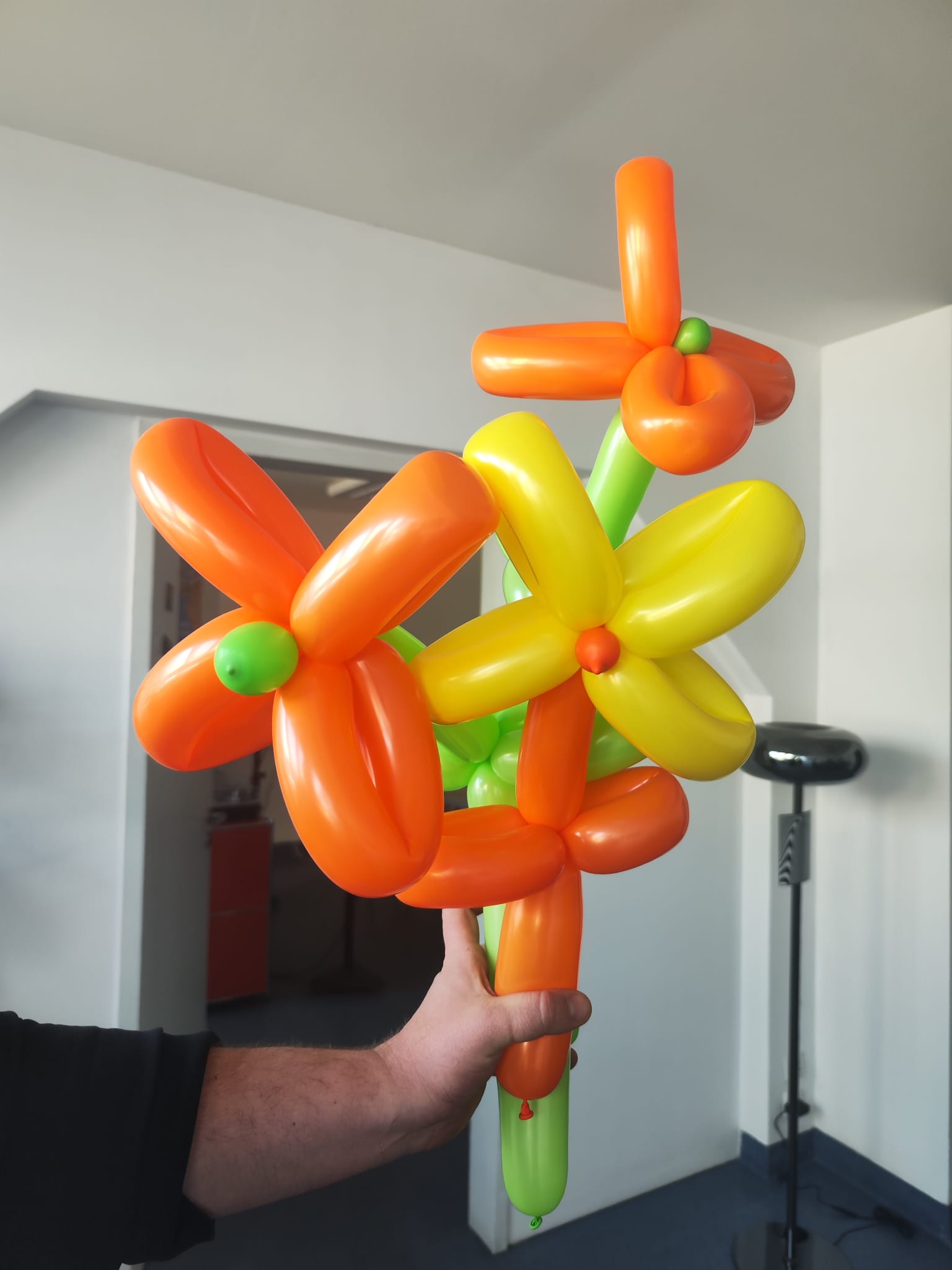 - Ballonfiguren: Zur Auswahl stehen Blume, Blumenkranz, Hund, Springmaus und Schwert. Wenn du selbst schon einen Ballonfiguren Workshop absolviert hast, stellst du die Ballonfiguren selbst her, wenn nicht, kann der/die jeweilige Teamleiter dir im Laufe des Tages die verfügbaren Figuren beibringen oder du lässt dir vom Teamleiter welche auf Vorrat herstellen, die du dann mit beim Schminken ausgeben kannst. Außerdem findest du unten Beispielfotos von verschiedenen Figuren.