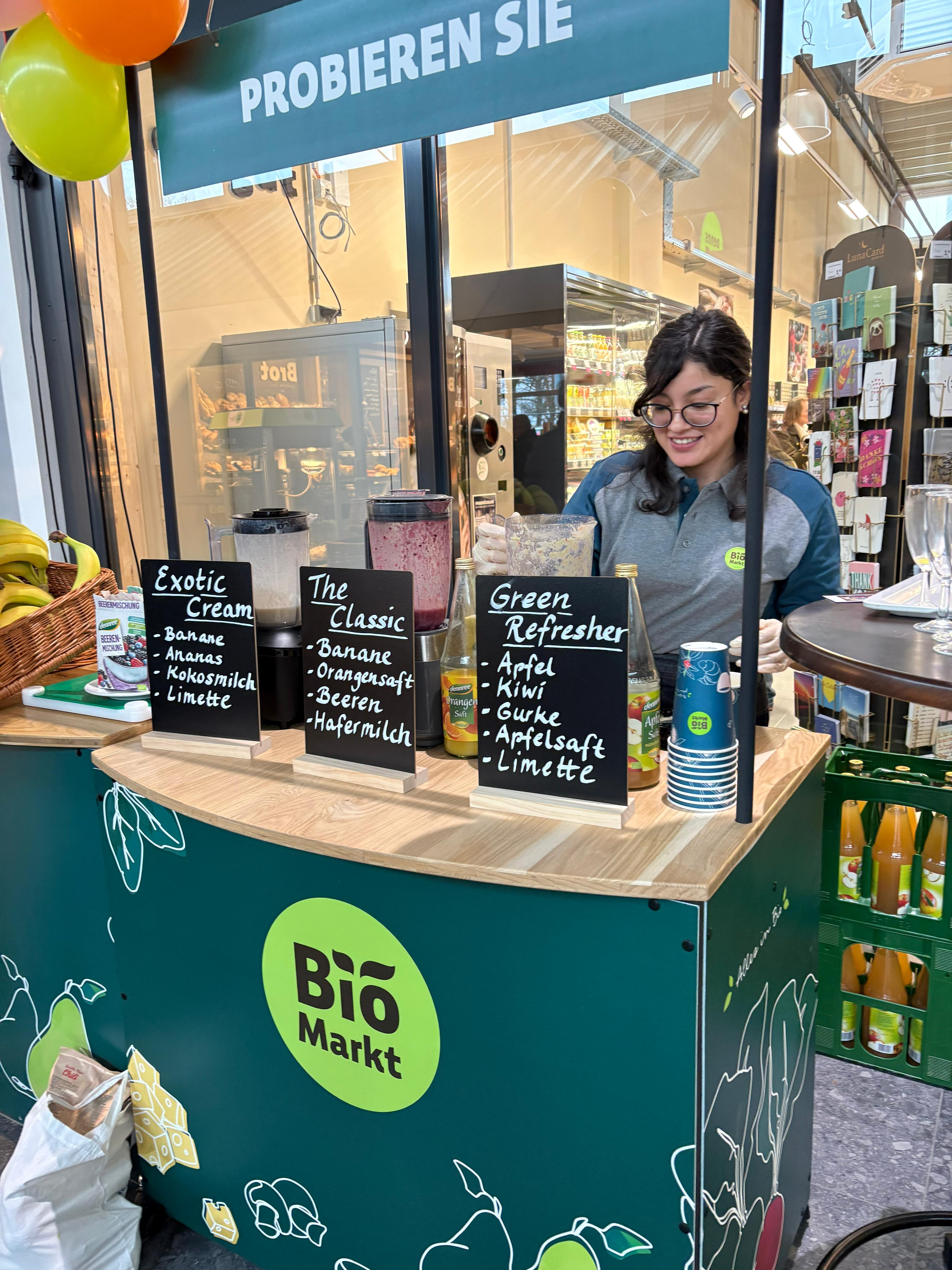 Den Tresen aufbauen, darauf Mixer, Tafeln und Arbeitsplatz im Eventbereich vorbereiten(siehe Foto). Nutzt einen Teil der Zutaten als Dekoration und versucht, dass ein bisschen hübsch herzurichten und dabei die Denn's Produkte zu präsentieren. Verwendet dafür Stehtische aus dem Markt und Teller und Servietten aus dem Bistro.